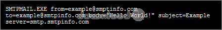 Send SMTP emails from the command line. Attachments, HTML. Example: SMTPMAIL.EXE from=example@smptinfo.com to=example@smtpinfo.com body="Hello World!" subject=Example server=smtp.smtpinfo.com.Antivirus information