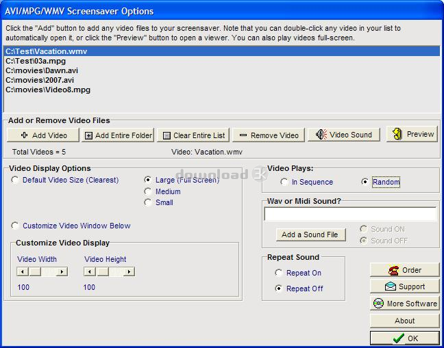 View your own MPEG, AVI, or WMV videos as a screensaver. You can play your videos randomly or in sequence, and you can adjust the size of the videos playing or stretch your videos full-screen if you wish. Video sound is also included, and you also have the option of turning off all video sound! Other options include previewing each video from the settings window, playing a midi or wav sound file, repeating the sound file, and password protection. You can also choose to play videos at their default video size for best video quality. Installation and uninstallation are included, and there are no additional run-time files needed. (Runs on ALL Windows systems).Requirements: Runs on all Windows systems