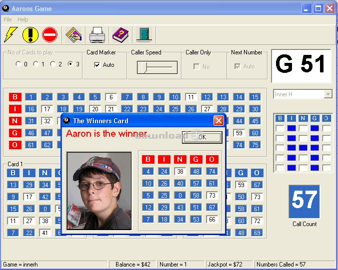 A new game of bingo, the shareware version comes with three games types, the registered version comes with lots more. You can even print out the cards and play with friends away from the computer. A new CallerOnly feature has been added at customer requests.Requirements: 486/66 and Sound card