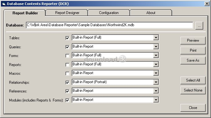 The Database Content Reporter System (DCR) provides you with a single tool to format and print your reports on the contents and setting of your Microsoft Access database. The DCR reports are fully customisable and for Access 2000 and above systems, reports can include images of your reports and forms. Also, the output from DCR can be to the printer, Microsoft Word document, or to a number of standard graphic file formats.Requirements: Microsoft Office 97/2000/XP/2003/2007