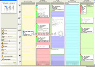 AyaNova includes an Outlook-style graphical Schedule screen where you can view multiple schedulable users at one time, as well as individual schedulable users. Create new workorders, edit existing, create views to display based on skills, certificates, as well as dispatch zones and regions that schedulable users belong to.