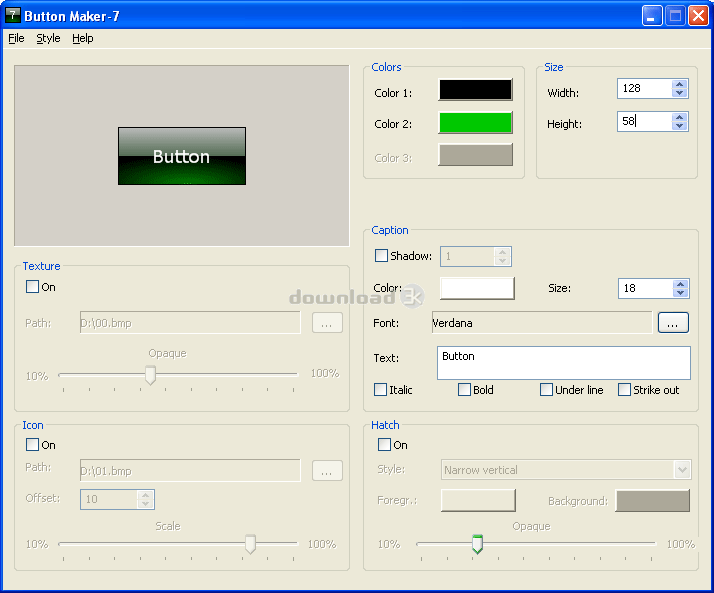 The program Button Maker-7 offers you the following possibilities: * Create original buttons or background images for web sites or applications using preset styles; * Create and save your own color presets (like a sub style); * Save and load a project; * Save button as image; * Create HTML code for button for three states: "normal", "mouse over", "pushed down"; * Create your own styles using simple graphic language.Requirements: Any computer with OS Windows