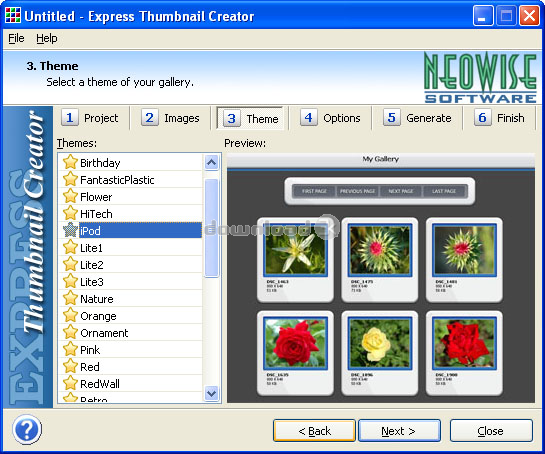 Express Thumbnail Creator will allow you to quickly and easily create professional-looking web image galleries ready to be published on the Web. Creating web image galleries has never been easier - just press a few buttons and let Express Thumbnail Creator do the entire job for you. The program features wizard-style interface and is manageable for anybody, including those who have absolutely no idea of HTML and image processing. If you are not satisfied with your new image gallery appearance, you can easily customize every single detail. The program comes packed with a number of gallery templates created by Neowise Software designers, and you can easily create your own and save them for future reuse. Express Thumbnail Creator recognizes all popular image formats and uses advanced algorithms for resizing images and creating thumbnails. If you have some knowledge of HTML, you can customize absolutely everything: change pages layout, use your own cascading style sheets, add links to outside pages and more. The evaluation version is fully functional and it does not make any changes to your images unless you request them.Requirements: Pentium Processor, 128Mb RAM
