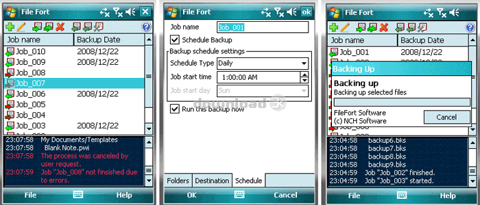 FileFort is free, easy to use file backup software that will automatically backup your critical data on Widnows CE devices to virtually any type of storage media including CD, DVD, Blu-ray and remote FTP servers. Dont take chances with your business' valuable data. FileFort lets you set and forget with its fully automated backup process, giving you peace of mind that your data is safe and secure.FileFort allows complete control over your backups. You can set your files to automatically or manually backup to a specified location. You can also schedule regular back times by date or time.