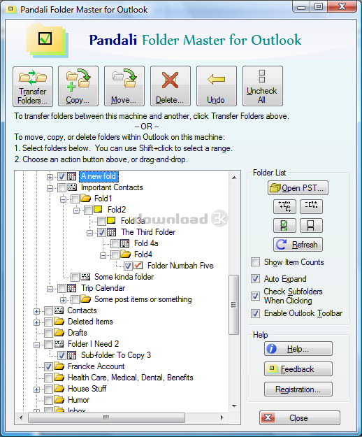 Pandali Folder Master helps manage Outlook folders.You can select multiple Outlook folders at a time to move, copy, or delete them, even between different PST files.