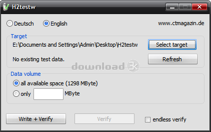 Apart from that, there’s a “Target” area, from which you can select the disk that you want to test with H2testw, as well as a “Data volume” area, where you can choose whether you want to test all available space of the device, or only a specific portion of it.