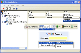 IE AutoLogin is an Internet Explorer Web Password Manager that allows you to log into a website with just one click. It seamlessly integrated with Internet Explorer and can be access from a toolbar that becomes a part of Internet Explorer, HTML page context menu or Internet Explorer main menu. IE AutoLogin Web Password Manager saves all login information from web form as your profile to protected location on your computer and easily completes and submits login form when you next time select this profile. IE AutoLogin allows import of Internet Explorer AutoComplete usernames and passwords.Requirements: MSIE 5.5 or higher