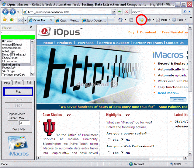 The Web browser is probably the most frequently used software today, and many tasks are highly repetitious. The iMacros software relieves the repetition of checking on the same sites every day, remembering passwords, data upload, image download, online marketing and functional testing and regression testing web sites over and over. With our Internet Macros technology, you record these tasks once and then let iMacros execute them whenever you need them. Any combination of browsing, form filling, clicking, and data extraction can be recorded into an Internet macro. Support for FLASH, JAVA and Silverlight applets and web site response time measurements are part of the advanced editions. It also includes a command line interface and ActiveX control Scripting component for use with batch files and VBS (WSH) and .NET scripting.The Scripting Edition performs functions normally found in applications costing thousands of dollars; the Scripting Edition is a low cost alternative to big name capture/replay testing tools. It includes an easy-to-use scripting interface that extends the popular Windows Scripting Host with the ability to replay Internet Macros and extract web page data. Users can also access this interface from Visual Basic, Visual C++, the new Microsoft .NET languages or any other Windows programming language that can access an ActiveX component, and perform unlimited data upload and management on web sites. The license includes a royalty-free distribution of the iMacros engine, so you can provide scripts to third parties.