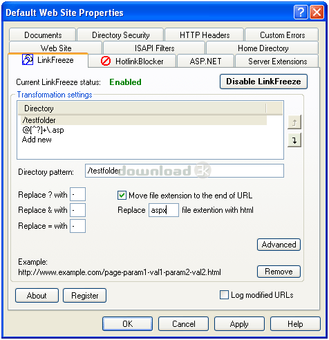 LinkFreeze is also safe for your current applications and backward links because all old dynamic links will remain working. Also it should be noted that the changes applied by LinkFreeze to your links will hide the technology your site is running on since there will be no .asp file extension in the link anymore. LinkFreeze is really flexible and you can configure the substituting characters and file extensions separately and apply different settings can be applied for different parts of your site.