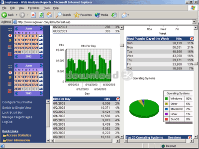 LogRover is an advanced web log file analyzer that analiyzes log files generated by IIS, Apache and other web servers. LogRover generates reports of page hits, sessions, visits, visitors, search engine referals, and session times. LogRover is database driven so it can generate interactive, on-demand reports as well as scheduled reports. LogRover supports clustered servers and features advanced reporting of search click-thru statistics. Charts generated by LogRover are the most attractive in the industry, and side-by-side comparison charts can be viewed.Requirements: 64 MB RAM 30 MB HD space