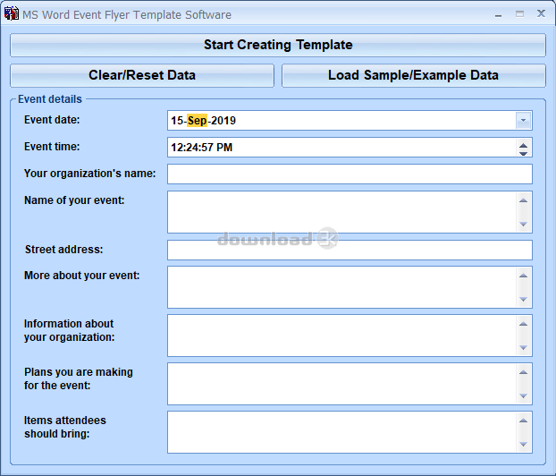 This software offers a solution to users who want to create single-page posters for events. Enter the event information in the main window by using the tab button to cycle through the data boxes of organization name, event name, address and so on. With one click the flyer is generated. This software will save you time by automatically formatting your event information in a bold, print-ready document. Word 2000 or higher required.Requirements: None