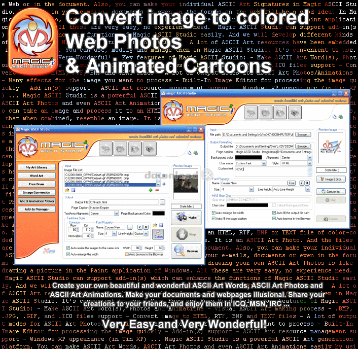 Magic ASCII Studio is a powerful ASCII Art generation platform. You can make ASCII Art Words, ASCII Art Photos and even ASCII Art Animations easily by using Magic ASCII Studio. Magic ASCII Studio can take an image and process it to an HTML, RTF, BMP or TEXT file of color-coded text characters, that when combined, resemble an image. It is an ASCII Art Photo. And the files are very worthy of being published to the Web or in the document. Also, you can make your individual ASCII Art Signatures in Magic ASCII Studio. Use them in your e-mails, documents or even in the forums on the web will be a good idea. In Magic ASCII Studio, drawing your own ASCII Art Photos is like drawing a picture in the Paint application of Windows. All these are very easy, no experience need.Magic ASCII Studio can support add-in(s) which can enhance the functions of Magic ASCII Studio easily. And we will develop different kinds of add-in(s) for Magic ASCII Studio in the future.