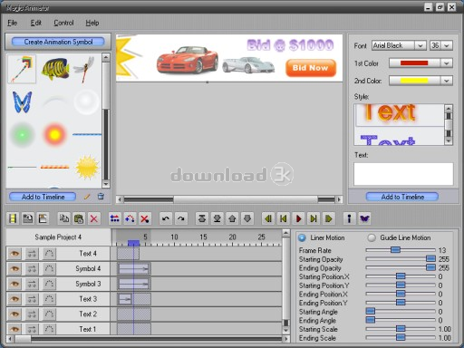 Magic Animator is a quick and powerful tool for making cool GIF animations, impressive banners and animated videos. Magic Animator introduces advanced timeline for animation editing. Which lets you manipulating animation symbols and texts, you can animate an object easily by creating liner motion and guide line motion. The layers technology helps to control over the object's size, placement, appearance and motion. To prepare your animation project, you can create animation symbols with its animation symbol creation tool and save them to symbol library. In addition to font size and color, you can apply special text styles like drop shadows, blur, glows or emboss. Magic Animator also provides lots of high quality animation symbols to help you express ideas and concepts, make your website or presentation more attractive and fun. Once finished, output can be exported as GIF, SWF and AVI clips.