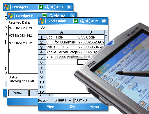 TWedgeCE is a universal data acquisition software for mobile devices or handhelds. This keyboard wedge software enables you to capture data from external devices (e.g. bar code readers, electronic scales, controllers, analyzers, RFID-readers, WLAN-devices, measurement tools, gauges, ...) with any Pocket PC, Windows CE or Windows Mobile application. Other platforms on request! TWedgeCE supports RS232 (serial interface, COM), Bluetooth, TCP and UDP connections.