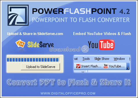 PowerFlashPoint automatically converts PowerPoint XP/2002, 2003 & 2007 presentations into highly compressed Internet-ready presentation in the Macromedia Flash format. PowerFlashPoint retains all special effects like Narration & Continuous Audio, Video, Animations & Transitions, Hyperlinks. Also reduce upto 98% of file size. Using PowerFlashPoint software users can easily integrate videos into presentations and quickly convert it to portable Flash. PowerFlashPoint automatically generates HTML page that allows placing Flash movie into a website or blogs. Share the converted Flash movie in SlideServe.com - online presentations sharing community, where you can share converted presentations publicly or privately infront of worldwide audience. SlideServe taking your PowerPoint presentation Online. Embed them into your blog or web sites. In SlideServe, user can Write comments, Rate presentations, Add them to favorites and also Add presentation to your Social bookmarks.