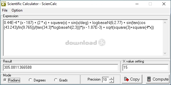 ScienCalc is a convenient and powerful scientific calculator. ScienCalc calculates mathematical expression. It supports the common arithmetic operations (+, -, *, /) and parentheses.The program contains high-performance arithmetic, trigonometric, hyperbolic and transcendental calculation routines. All the function routines therein map directly to Intel 80387 FPU floating-point machine instructions.