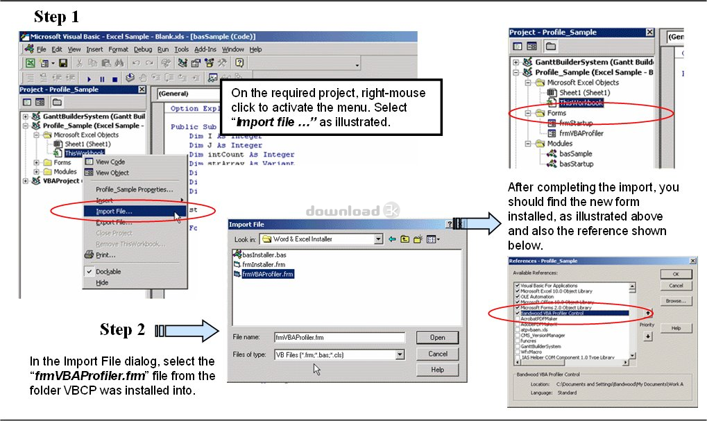 The VBA Code Profiler System (VBACP) provides a system to profile Microsoft VBA based applications. This will allow analysis of your code for performance and path tracking throughout your VBA project. The VBACP system will operate on any Microsoft VBA based application from Office 97, 2000, and XP. Every procedure and function can be profiled to ensure the most comprehensive coverage of your code. You can see how much time is spent in each routine, and which routines are call more frequently, even which routines have not be called at all.The output is in the form of a text based report to allow importing into Excel and other tools for graphing purposes.