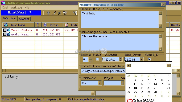 WhatNext is a ToDo Application, solely designed to keep track of the things you have todo.WhatNext helps to keep track on your tasks in a convenient and transparent way. The ToDo items are colored with respect to the item type, to provide the relevant information on the fly.