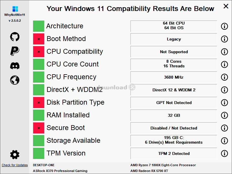 WhyNotWin11 is a powerful and easy-to-use Windows software that provides users with a detection script to help them identify any compatibility issues that may be preventing their PC from being Windows 11 release-ready. The software runs through the currently known system requirements for Windows 11, including architecture, boot method, CPU compatibility, CPU core count, CPU frequency, DirectX + WDDM2, disk partition type, RAM installed, secure boot, storage, and whether or not TPM minimum is activated.