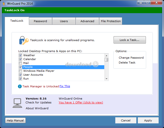 The GUI of this application is quite decent, modern, and intuitive; the layout is designed in such a way so that anyone with or without much technical experience can easily get accustomed to it. All the main menu options are shown as tabs at the top of the window, namely – TaskLock, Password, Users, Advanced, and File Protection. The main restrictions for Windows programs or a running task can be applied from ‘TaskLock’ tab. More settings for protection can be done from ‘Advanced’ and ‘File Protection’ tabs; where the former can disable IE or block software installation and the latter can encrypt any file/folder. Button for viewing Help manual is shown at the bottom of the window.
