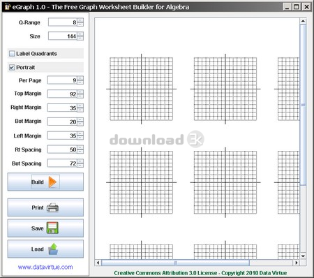 eGraph is the perfect solution for building custom graphing worksheets on the fly, or displaying professional graphs for efficient classrom instruction.eGraph is Free and Open Source, meaning you can use it freely in any setting--high school, college, university, or home schooling. The source code is perfect for study and modification in Java programming courses. Available as a standard Netbeans project, eGraph source code is fully documented making it is easy to learn from and modify.