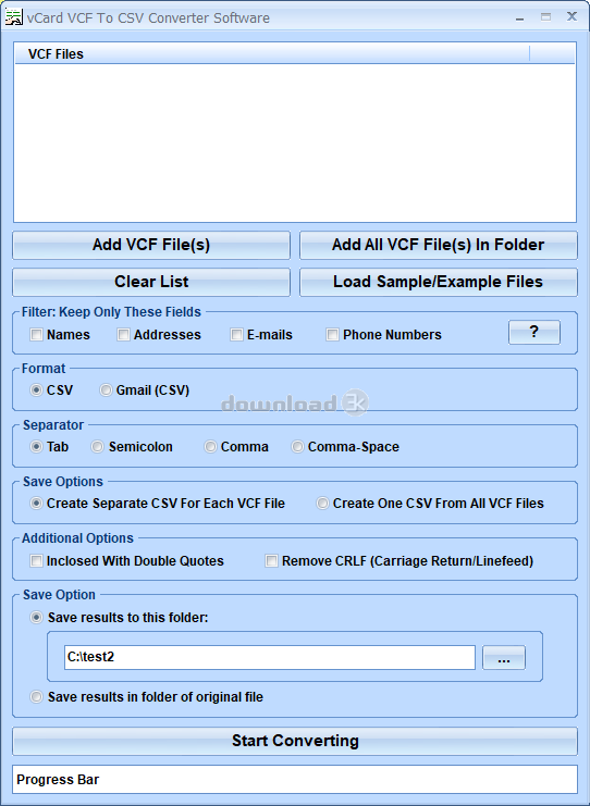 This software offers a solution to users who want to quickly convert multiple VCFs to CSVs. Simply drag and drop VCF files into the software and then click a button to start the process. There are features to extract only names, addresses e-mails or phone numbers. There is also a feature to save files in Gmail CSV format so contacts can be imported to Gmail. There are features to format the CSV output with tabs, semicolons, commas, comma-spaces, double quotes, carriage returns, etc. Output CSV files will be put in the same folder as the source VCFs.Requirements: None