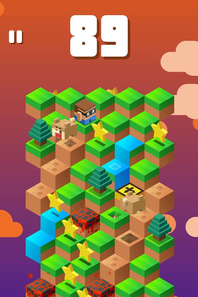 The game begins from the top of the mountain, and after taking a single step the tiles start collapsing behind you so you have to move fast if you don’t want to crumble with them. Obviously the dangers don’t stop there, as more obstacles await ahead. More specifically, you will encounter spikes that appear and disappear in a matter of seconds, deadly lava cubes waiting to turn you into crisp, sand tiles that drop down quickly (so you mustn’t stay too long on them) and cracked tiles that will collapse the same moment you step on them (so you need to avoid them at all costs). Infamous TNT tiles are also present and the wise choice would be to avoid them, but even if you can’t, make sure to jump away from them quickly because they explode shortly after you step on them. Even if you’re on the tile next to it you’re in danger of being blown up so go as far as possible.